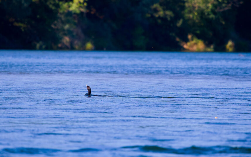 Snagged fishing gear clings to submerged branches, shoreline trees, and underwater plants, creating hidden dangers. Birds swallowing fish that have ingested hooks suffer slow deaths, tethered to logs or branches. Entangled waterbirds become immobilized, isolated from their flocks, and easy prey for predators. Even live bait left onshore attracts and endangers dogs, coyotes, and other animals that call the river home.